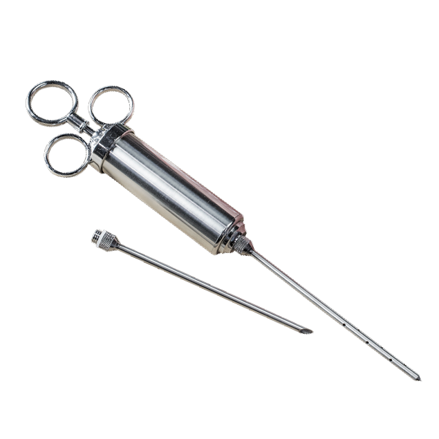 Профессиональный кулинарный шприц для маринадов сделан из пищевой нержавеющей стали. Имеет два вида насадок для введения маринадов внутрь крупных кусков мяса или птицы.