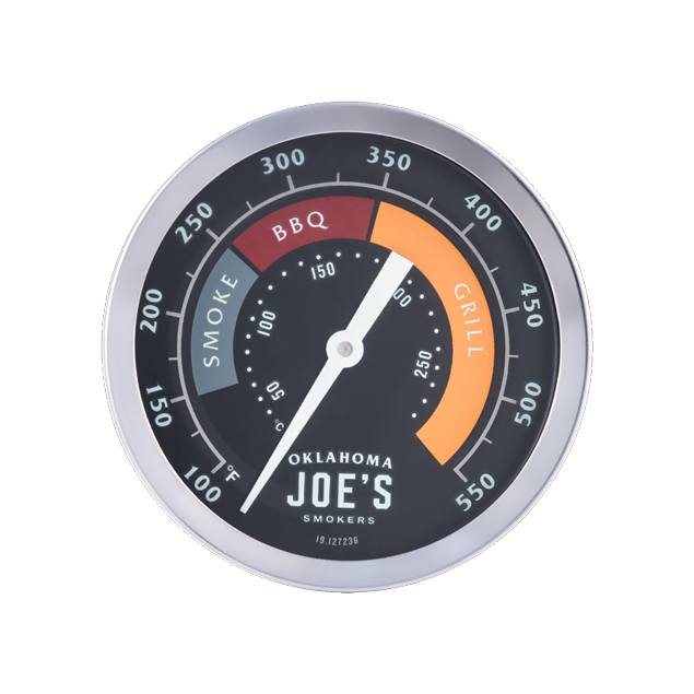 Крупный, 3-х дюймовый профессиональный термометр Oklahoma Joe's® Вкручивается в дополнительное гнездо в крышке коптильной камеры. Идеально подходит для тюнинга вашей коптильни.